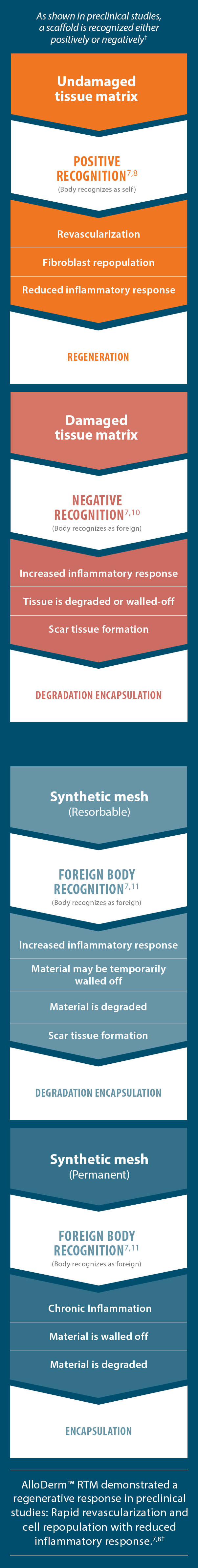 As a synthetic mesh resorbs, it is replaced with scar tissue, which may impact the structure, function, and physiology of the repair site. An intact, extracellular matrix will enable the site to transition into host tissue with native structure, function, and physiology through regeneration.1,2