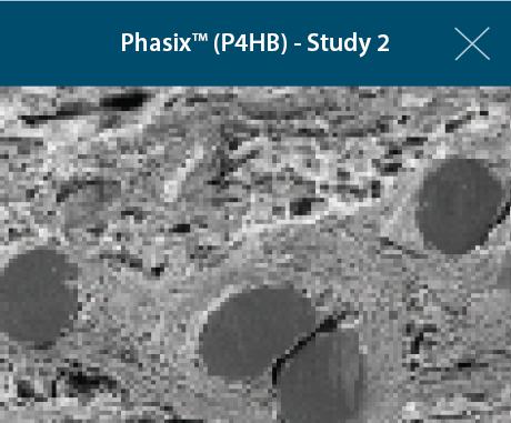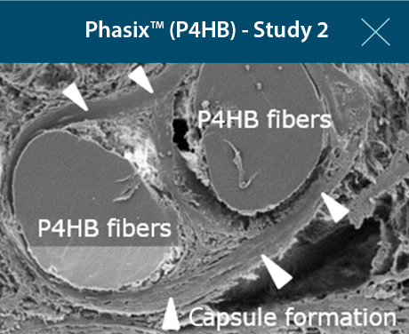 Capsule formation around the synthetic fibers was demonstrated in scanning electron microscopy images, which may contribute to mesh contraction in vivo. White arrows depict a denser and more pronounced capsule at 6 months for P4HB mesh.5-7